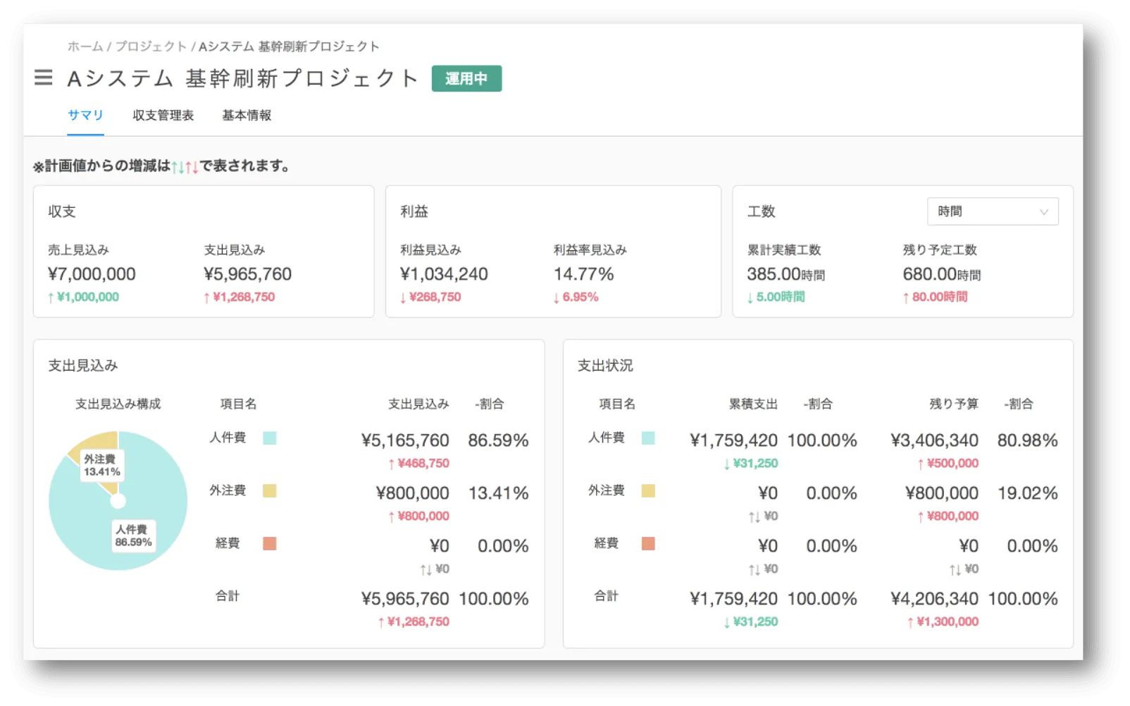 プロジェクト毎の売上・人件費・外注費・経費・稼働工数といった数値情報をプロジェクト毎に紐づけて管理することができます。収支状況を瞬時に確認することができ、赤字プロジェクトの早期発見や要員配分の最適化を行うことによる事業利益に改善に繋げることができます。