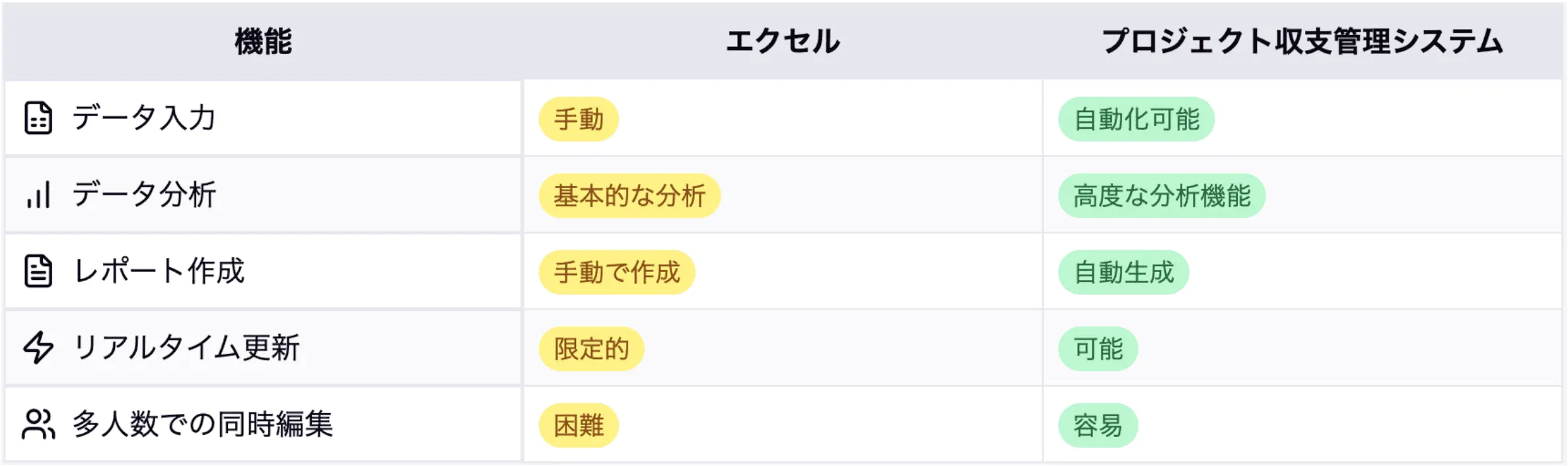機能面では、エクセルがデータ入力や基本的な分析、手動でのレポート作成に留まるのに対し、プロジェクト収支管理システムは自動化されたデータ入力、高度な分析機能、自動レポート生成、リアルタイム更新、多人数での同時編集などが可能です。