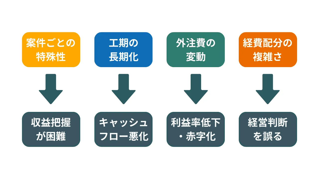 こうした課題を放置すると、「利益は出ているはずなのに資金が不足する」「黒字案件と思っていたら実際は赤字だった」といった事態を招きます。